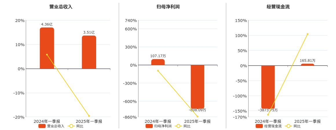 公司营业总收入为3.51亿元,较去年同报告期营业总收入减少8555.62万元,同比较去年同期下降19.60%。归母净利润为-808.09万元,在已披露的同业公司中排名第24,较去年同报告期归母净利润减少915.26万元,同比较去年同期下降854.01%。经营活动现金净流入为165.81万元,在已披露的同业公司中排名第18。